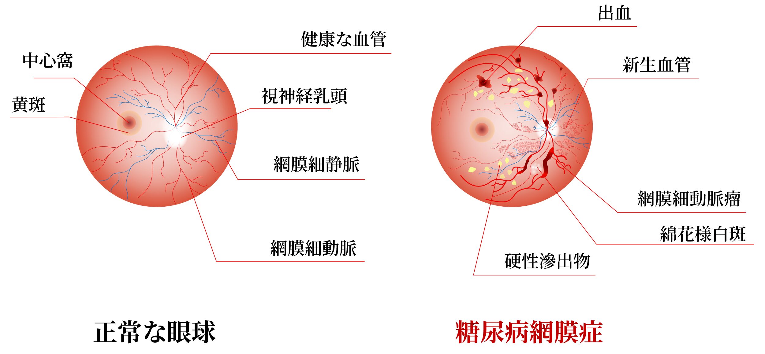 糖尿病で高血糖状態が長く続くと、網膜の細い血管がダメージを受けてつまり、出血や新しいもろい血管(新生血管)の発生、網膜剥離などを引き起こします。
