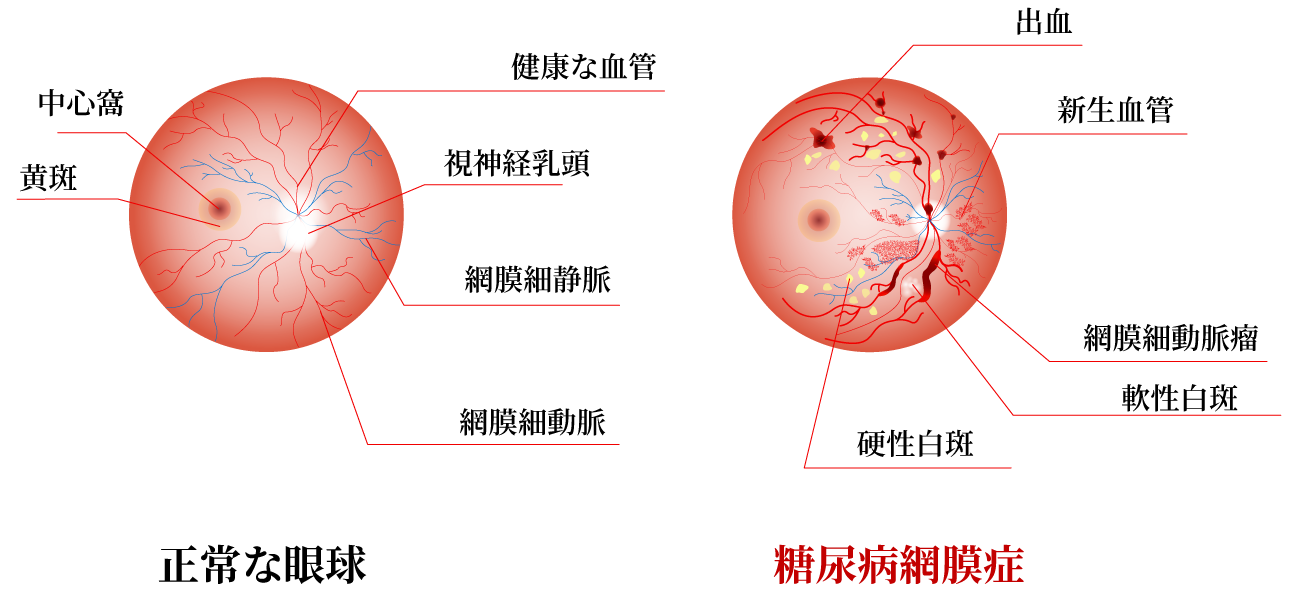 糖尿病で高血糖状態が長く続くと、網膜の細い血管がダメージを受けてつまり、出血や新しいもろい血管(新生血管)の発生、網膜剥離などを引き起こします。