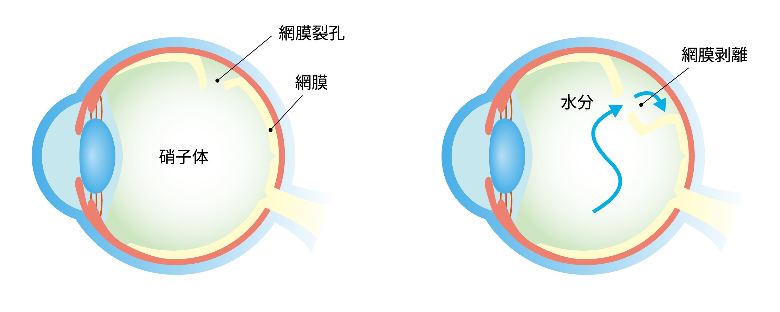 網膜裂孔は網膜に裂け目や穴が生じることをいい、網膜剥離の原因になります。網膜剥離は、網膜の穴(裂孔)から眼の中の水が入り網膜が眼底から剥がれる病気です。剥がれた網膜は機能しないため、その部位に相当する視野が欠けたり、視力が低下します。放置しておくと失明の可能性も出てきますので適切な治療が必要です。